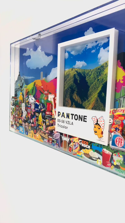 Surrounding the Ávila landscape, colorful pop-art elements and emblematic Venezuelan icons come together in a vibrant visual archive of nostalgia, humor, and collective identity. Encased in crystal-clear acrylic, the artwork balances contemporary pop aesthetics with emotional depth, turning identity into color, code, and form.